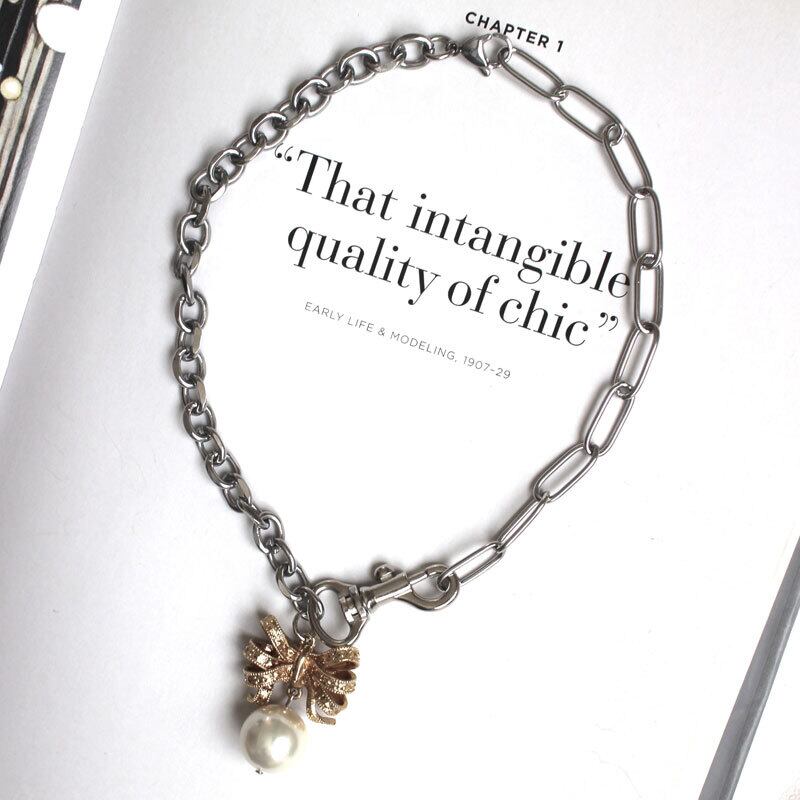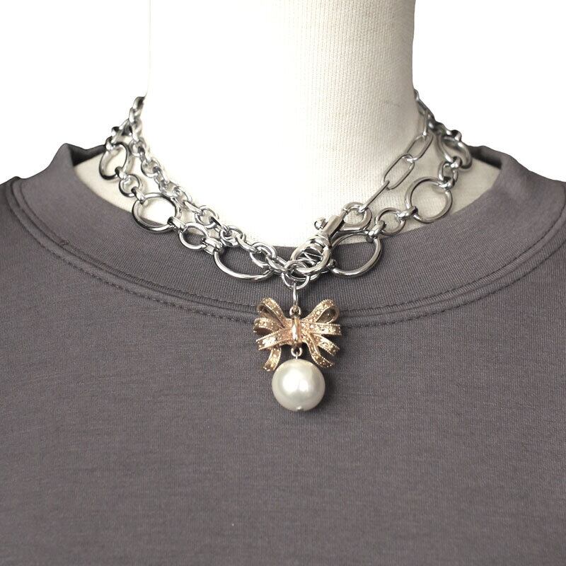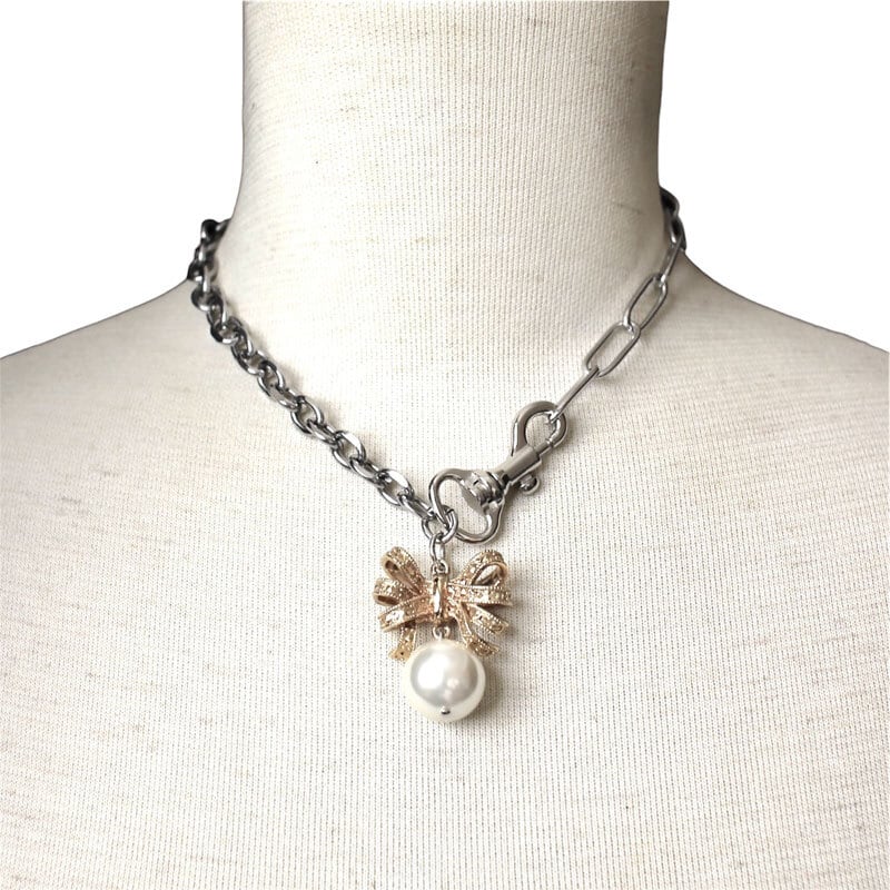 ヴィンテージゴールドリボンとシルバーのミックスネックレス。