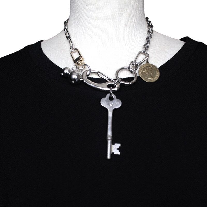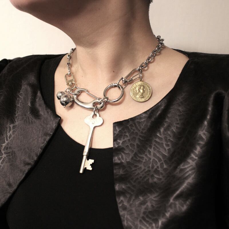 ヴィンテージキーチャーム、コイン、現行パーツをmixし、2種類のチェーンを組み合わせた遊び心のあるデザイン。