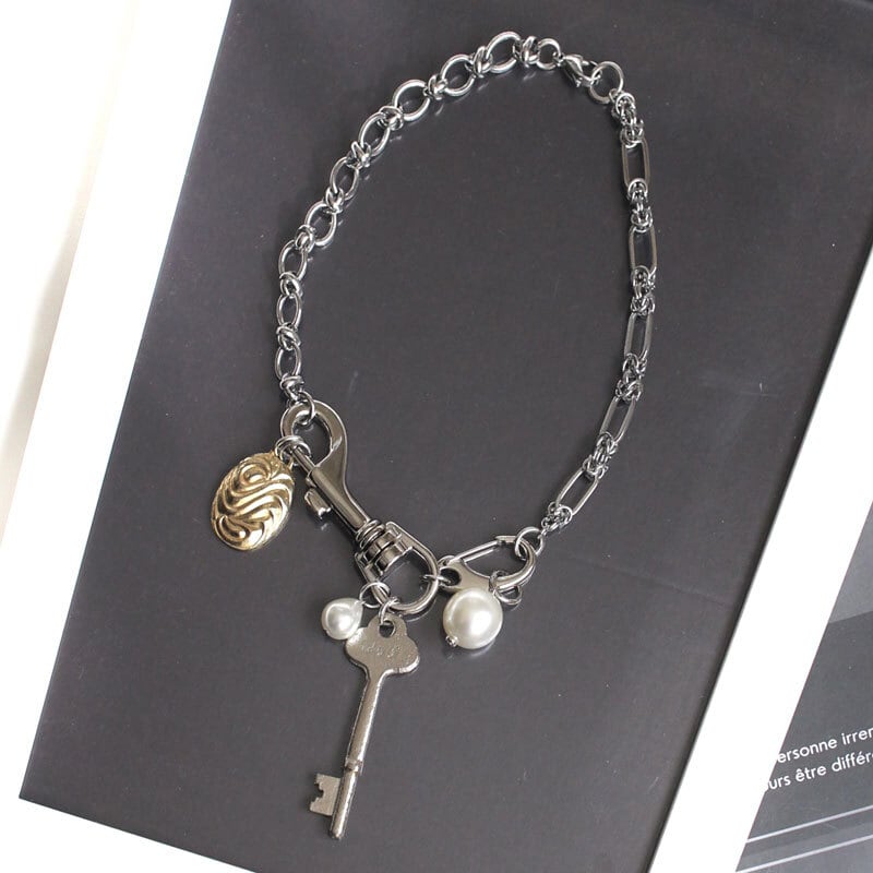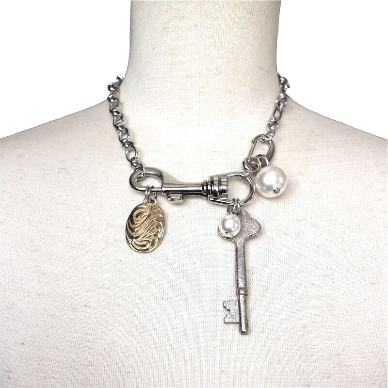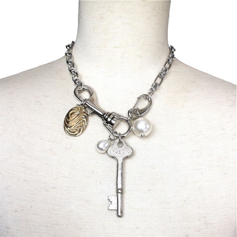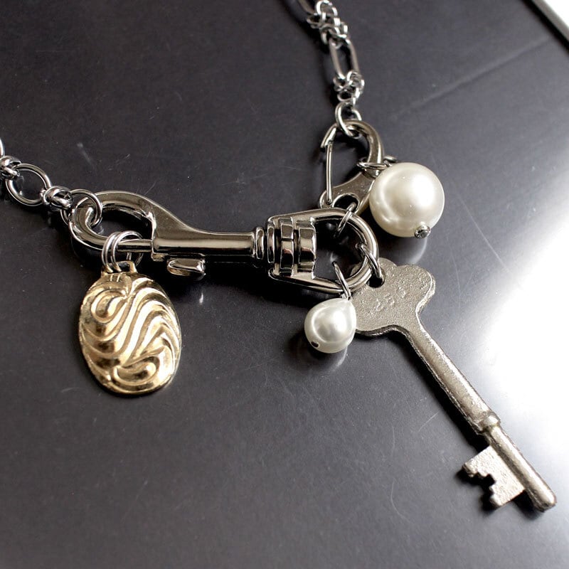 ヴィンテージキーチャーム、ヴィンテージと現行パーツをmixし、2種類のチェーンを組み合わせた遊び心のあるデザイン。